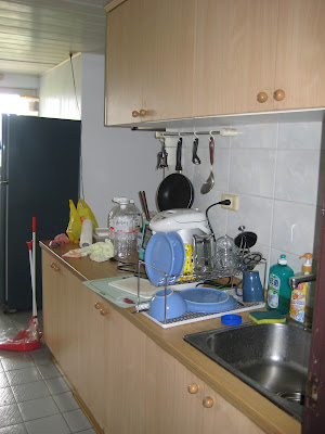 The bad news is that the apartment was trashed (literally) when we moved in. My new bedroom is right next to the kitchen and all the trash in the apartment (possibly several weeks of it) was left piled up in my doorway. Which meant that there were bugs. Lots of bugs. For our first order of business as the new tenants, Christine and I sorted and bagged up all the trash and threw it on the back porch so it wouldn't keep attracting creepy crawlies to our kitchen. Then came the Raid. We pretty much used an entire can of Raid on the kitchen alone.